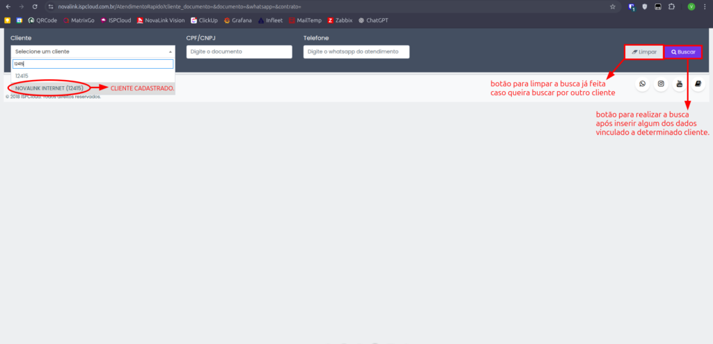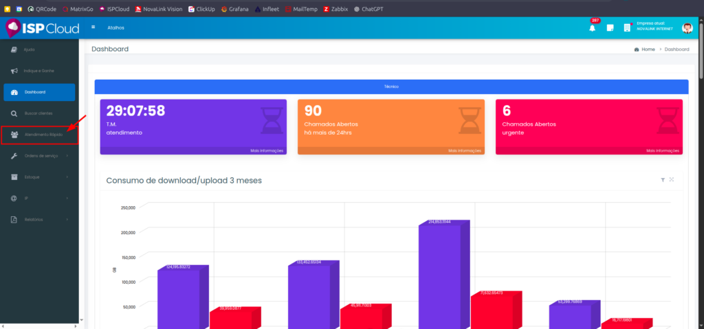 Agora que já estamos na tela inicial, daremos início ao processo de autenticação de ONUs. Primeiramente iremos abrir a aba de “Atendimento rapido” para conseguir pesquisar pelos cliente cadastrados no sistema: