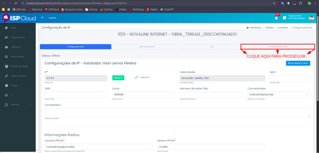 Finalizada a vinculação da CTO ao cliente, prosseguiremos com o registro do lacre associado à instalação do cliente.