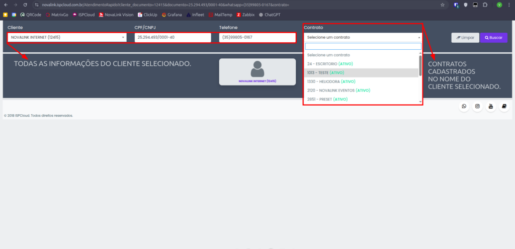 Após localizar o cliente desejado, você deverá selecionar o contrato específico para realizar quaisquer alterações ou consultar informações.