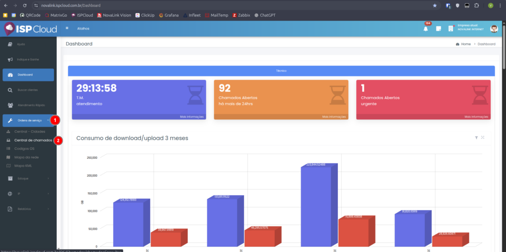 Retornando ao Dashboard (tela inicial), clique em “Ordens de Serviço” (1), para então prosseguir para “Central de Chamados” (2).