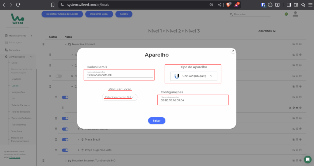 Finalizada a etapa de adição do local e seus respectivos parâmetros, daremos início ao processo de vinculação do equipamento a ser implantado no ponto definido.