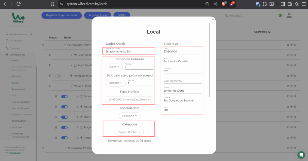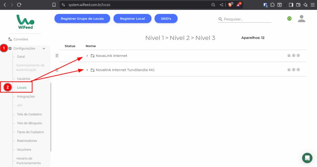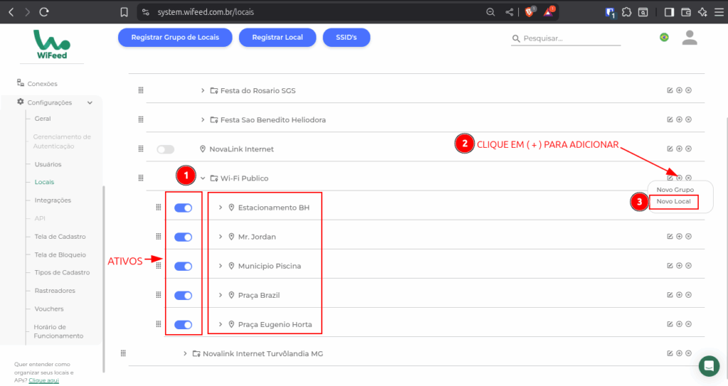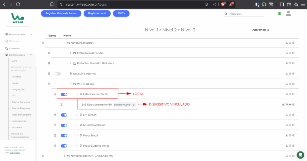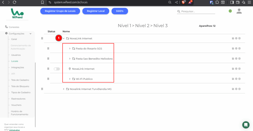 Após expandir o local [ NovaLink Internet ], serão exibidos os sub-locais cadastrados (por exemplo: Festa do Rosário SGS, Festa São Benedito Heliodora, Wi-Fi Público, entre outros).