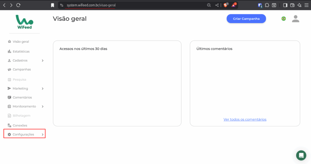 🔹 Acesse o painel do WiFeed utilizando suas credenciais de login; após a autenticação, será exibida a tela inicial do sistema, semelhante ao exemplo mostrado no print abaixo.